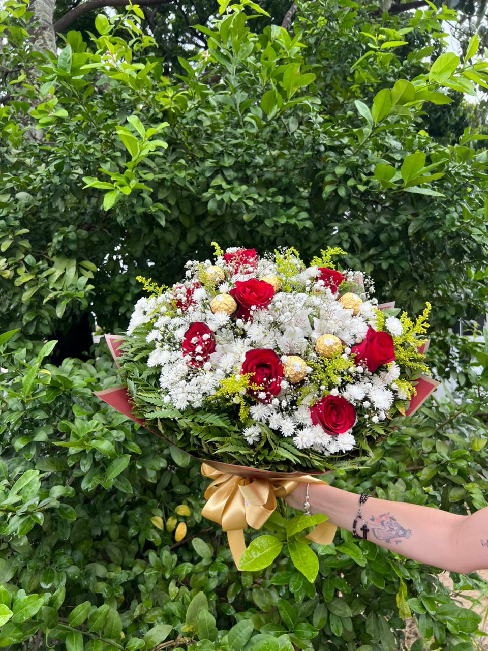 O Rosas & Doce Encanto Ă© um buquĂȘ sofisticado composto por 8 rosas vermelhas frescas harmonizadas com 6 chocolates Ferrero Rocher, envolvidos por flores complementares e folhagens que trazem leveza, elegĂąncia e um toque especial ao presente.