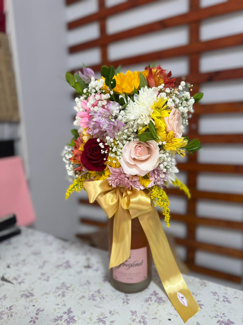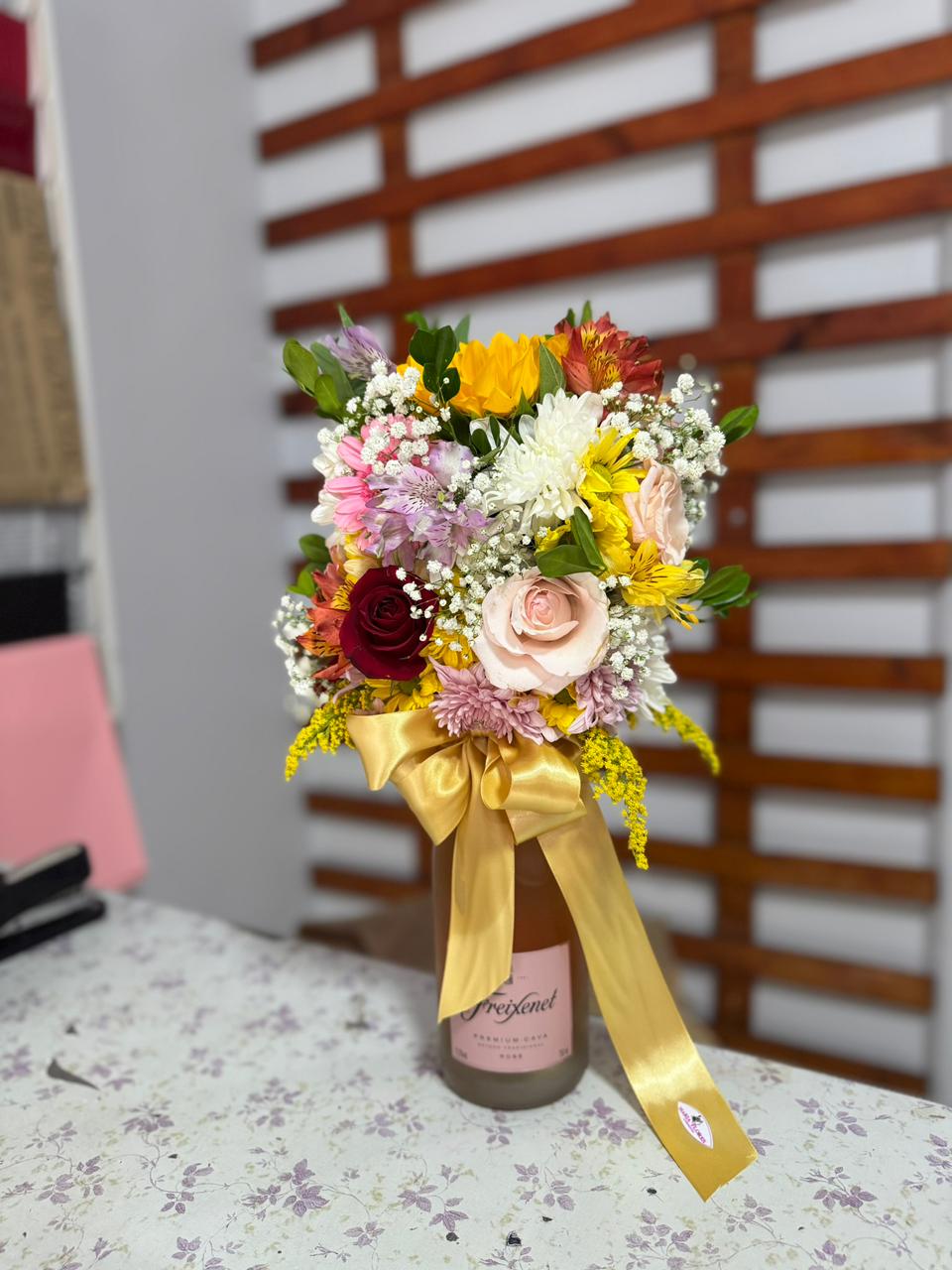 Composto por flores selecionadas em tons suaves e harmoniosos, o arranjo é cuidadosamente montado para ser utilizado em vinhos ou espumantes, criando um visual refinado, criativo e encantador. Finalizado com um laço elegante, é um presente que transmite carinho e bom gosto em cada detalhe.