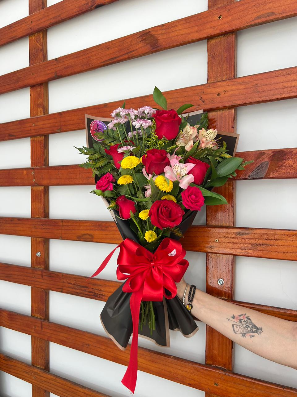 A Abraçada de Rosas Vermelhas é composta por 6 rosas vermelhas, harmonizadas com folhagens e acabamento impecável, criando um visual marcante, romântico e sofisticado.