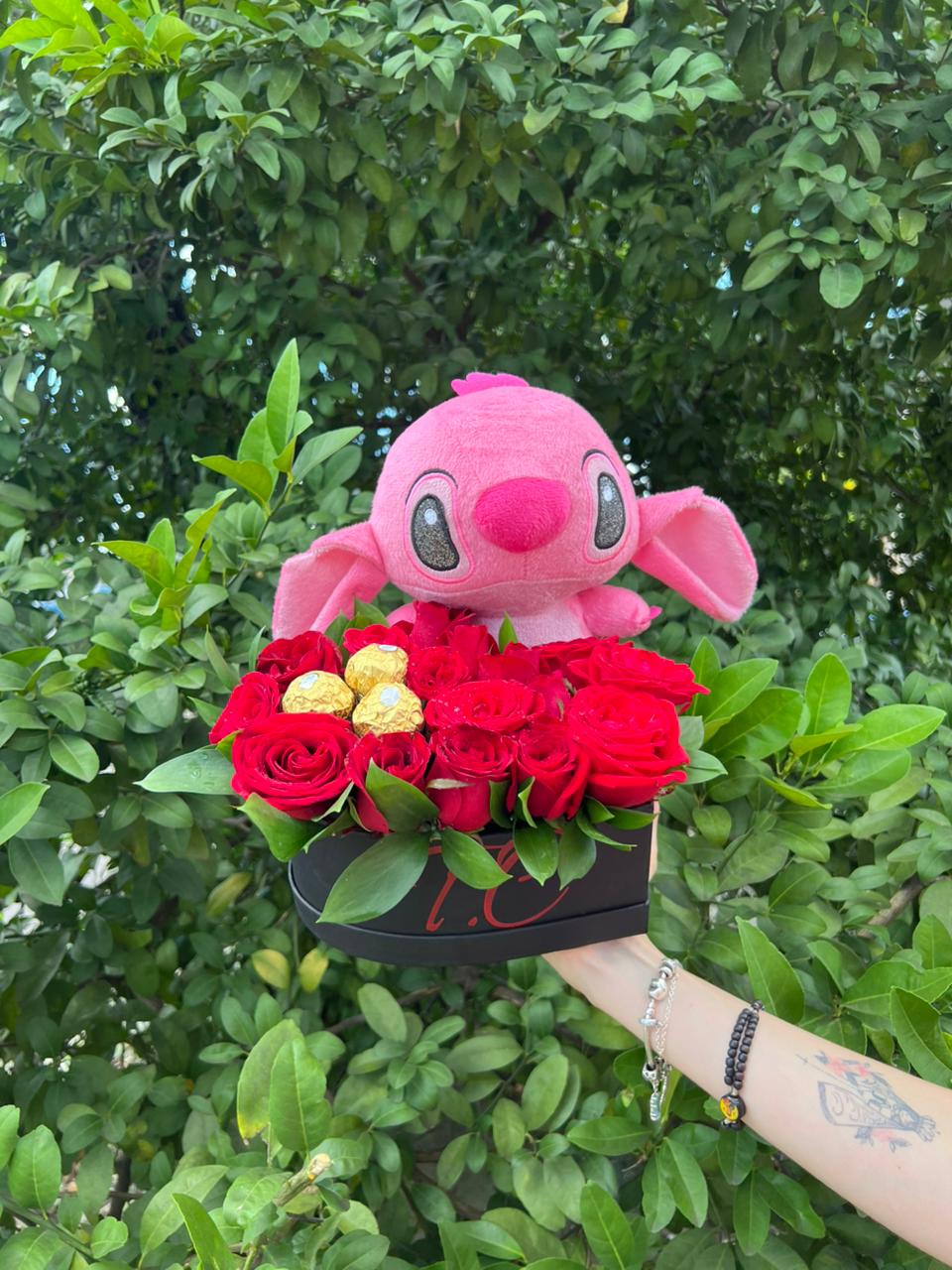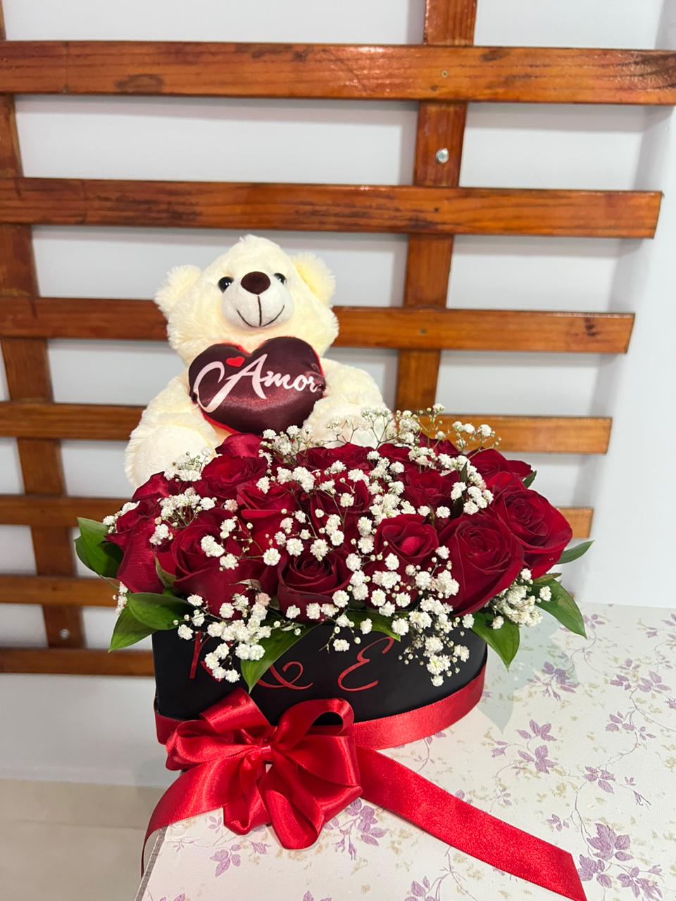 De um lado, a box traz rosas vermelhas naturais, símbolo clássico do amor e da paixão, cuidadosamente montadas em espuma floral, que garante hidratação e maior durabilidade das flores. Do outro lado, a composição é preenchida com uma pelúcia macia, criando um contraste perfeito entre romantismo e carinho.