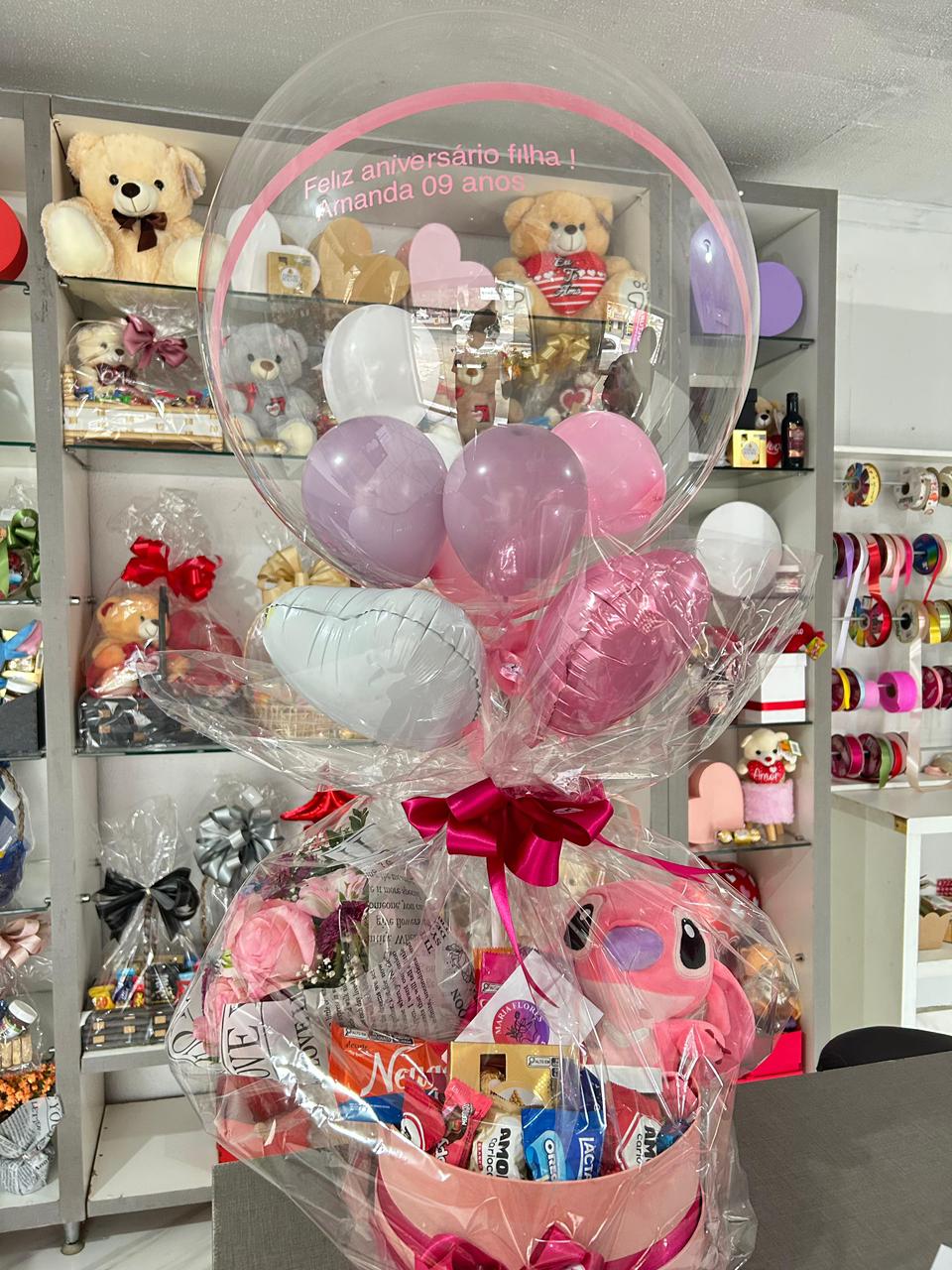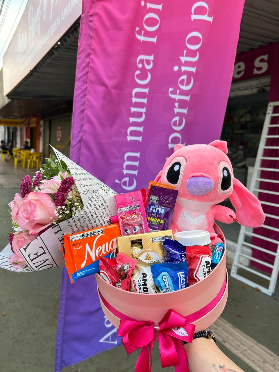Dentro dela, um mini buquê de flores, uma pelúcia fofa e uma seleção irresistível de chocolates nacionais e importados criam a combinação perfeita entre doçura, carinho e beleza.