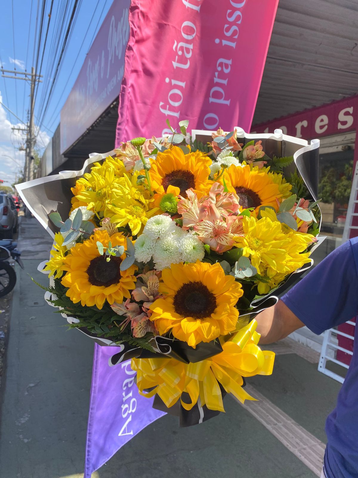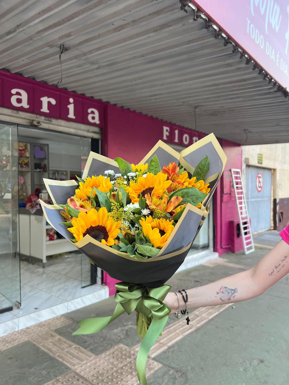 A alegria e o brilho do sol reunidos em um buquê encantador! São 5 girassóis fresquinhos, selecionados com todo cuidado, combinados com folhagens e um acabamento floral especial que valoriza ainda mais a sua beleza 🌿