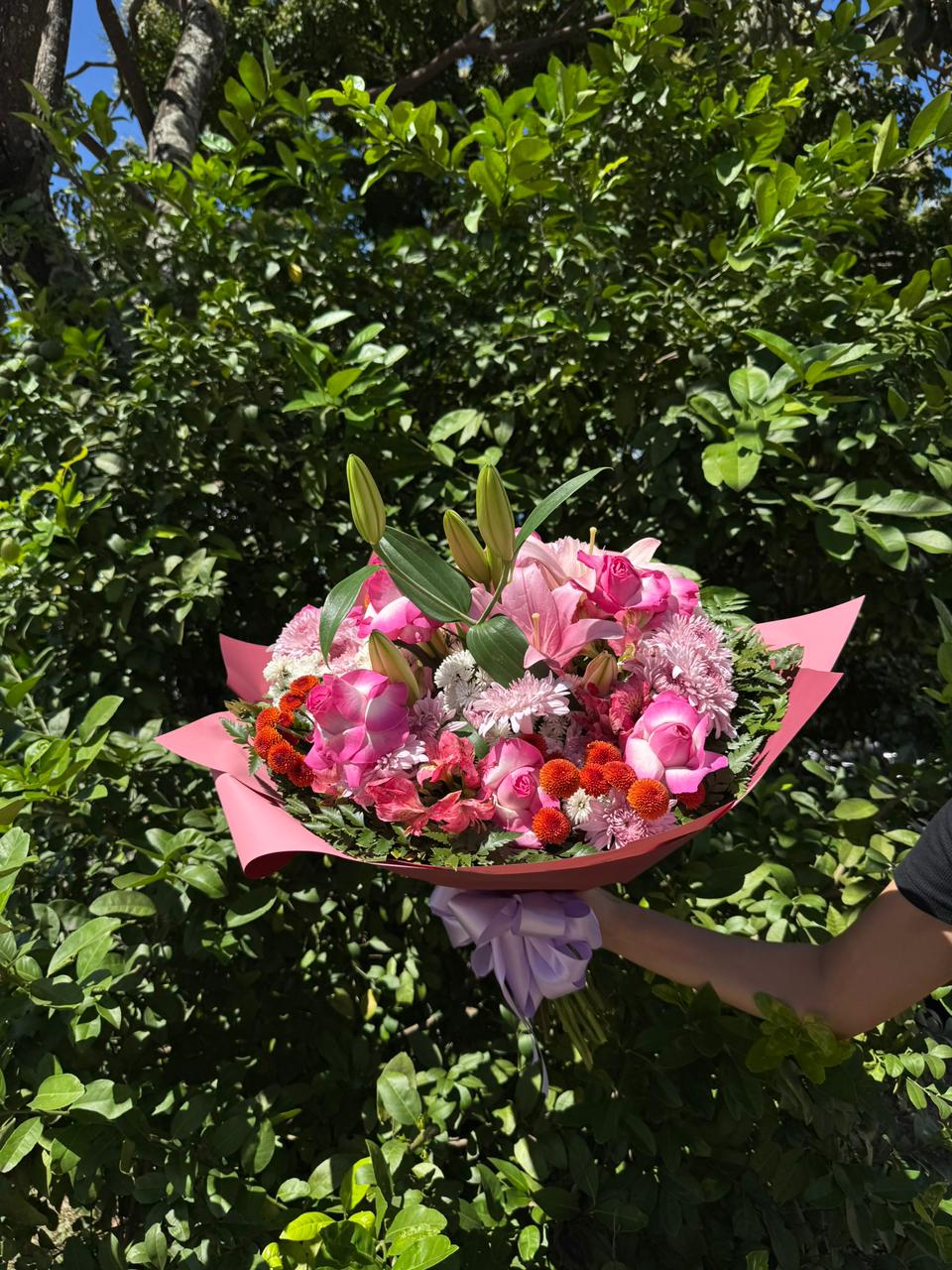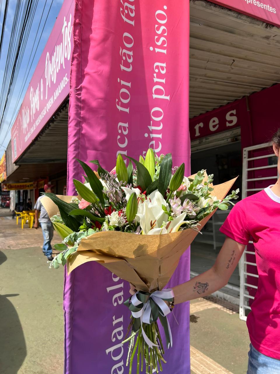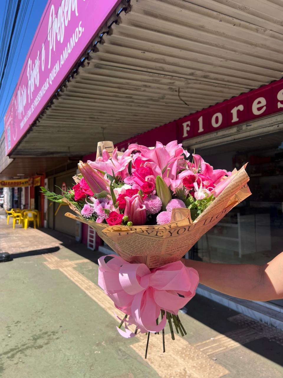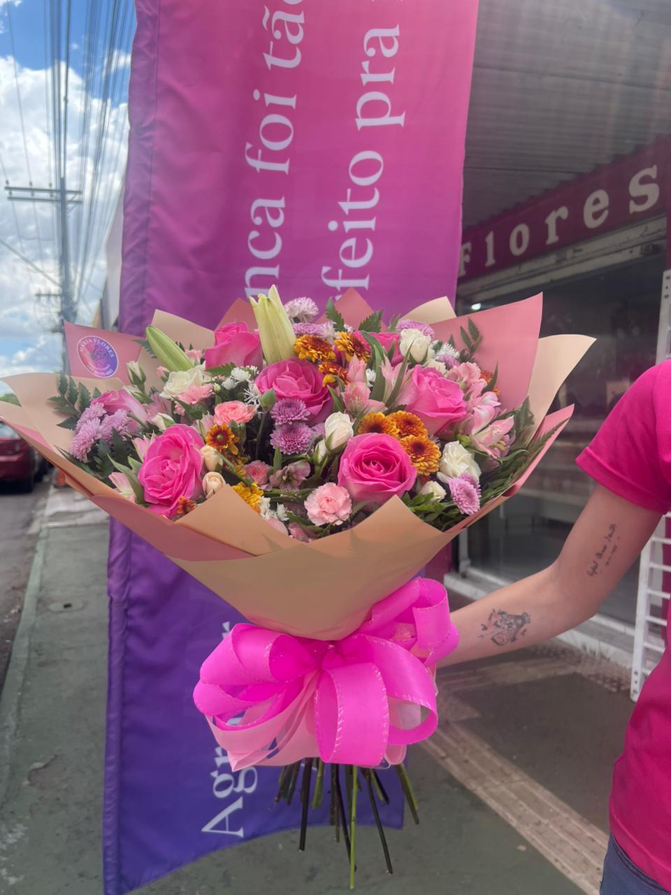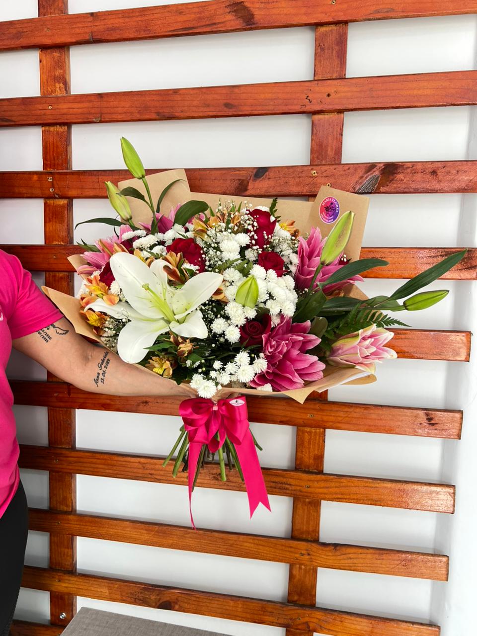 Um buquê cheio de elegância e sofisticação! O Buquê com Lírio é uma escolha deslumbrante que combina a majestade dos lírios rosa com a delicadeza de flores complementares em tons vibrantes, como rosas vermelhas e gérberas laranjas. Finalizado com um acabamento em tecido decorativo, este arranjo é perfeito para surpreender em ocasiões especiais, como aniversários, celebrações ou momentos românticos.