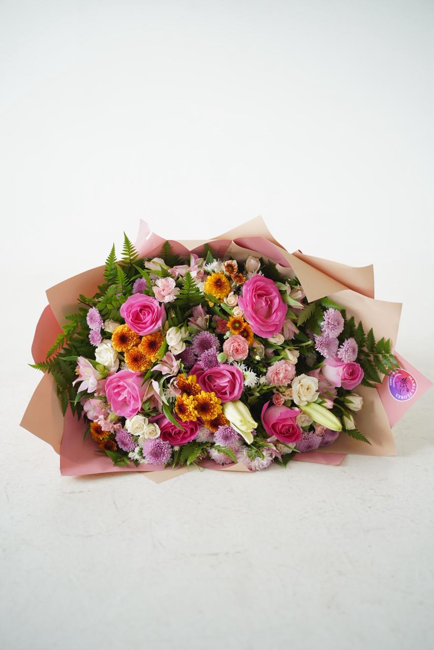 Este buquê harmoniza cores e texturas de forma única, criando um visual exuberante que transmite carinho, alegria e sofisticação.