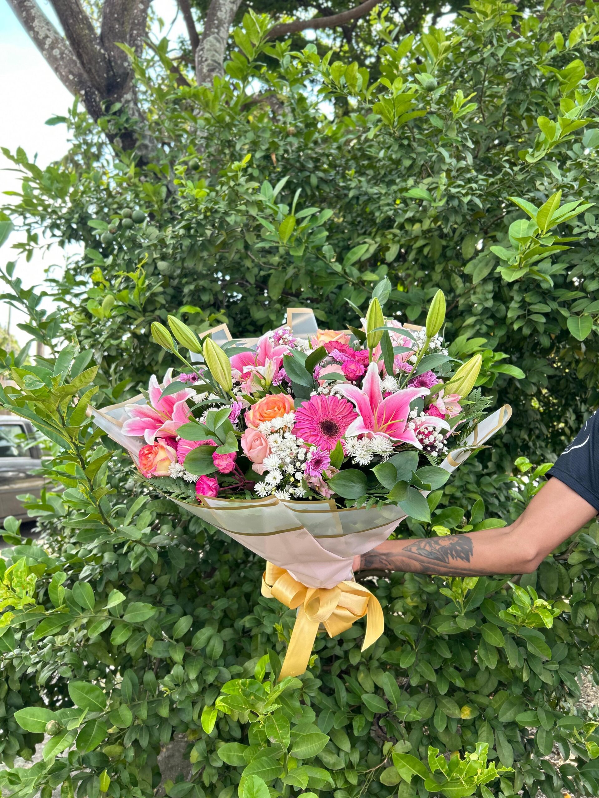 Ele reúne flores imponentes e nobres, como o lírio e a gérbera, que trazem presença e imponência ao arranjo, combinadas com rosas selecionadas em diferentes tonalidades de rosa, resultando em um buquê marcante, porém suave e delicado.