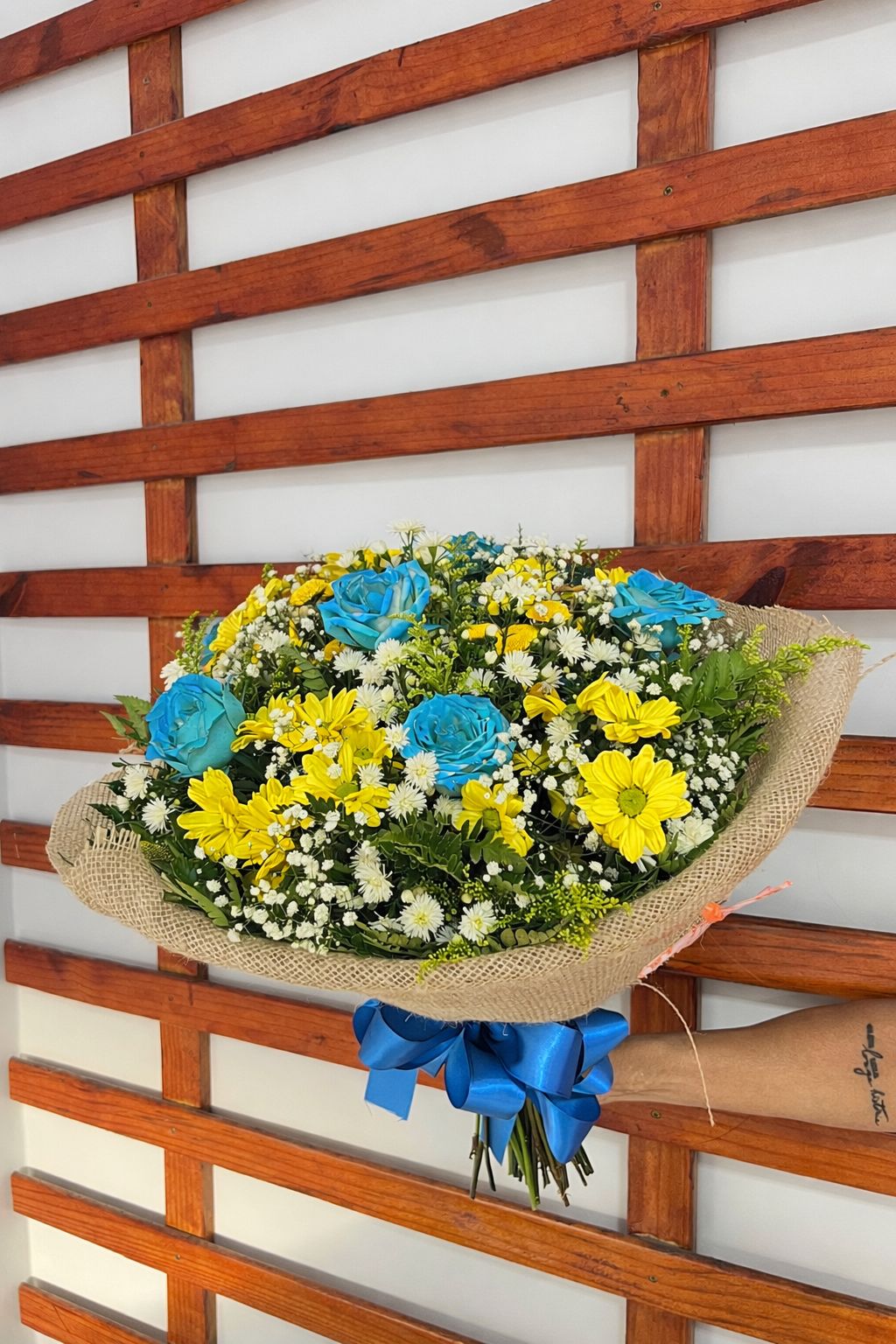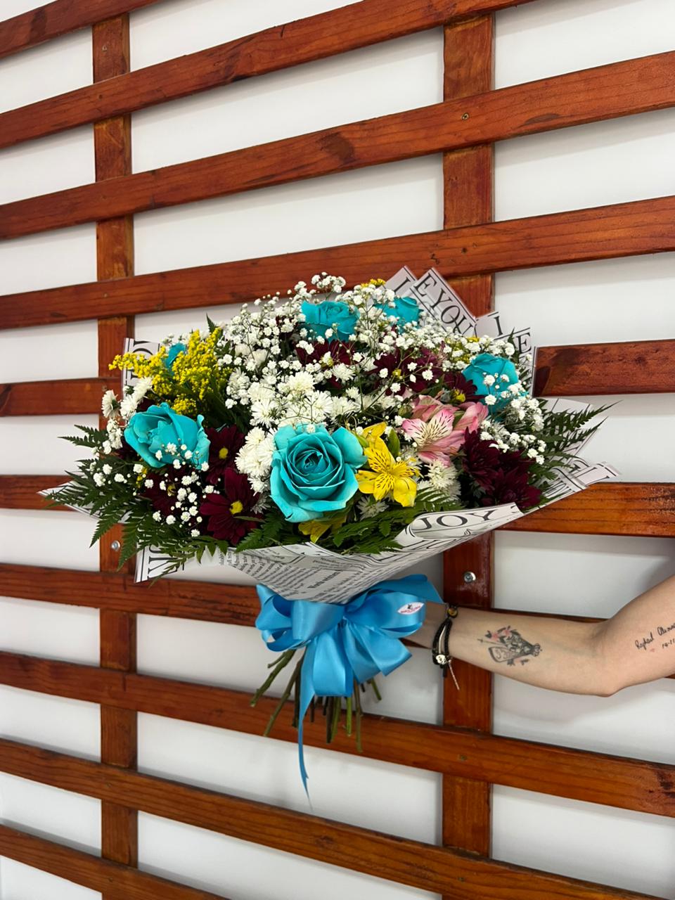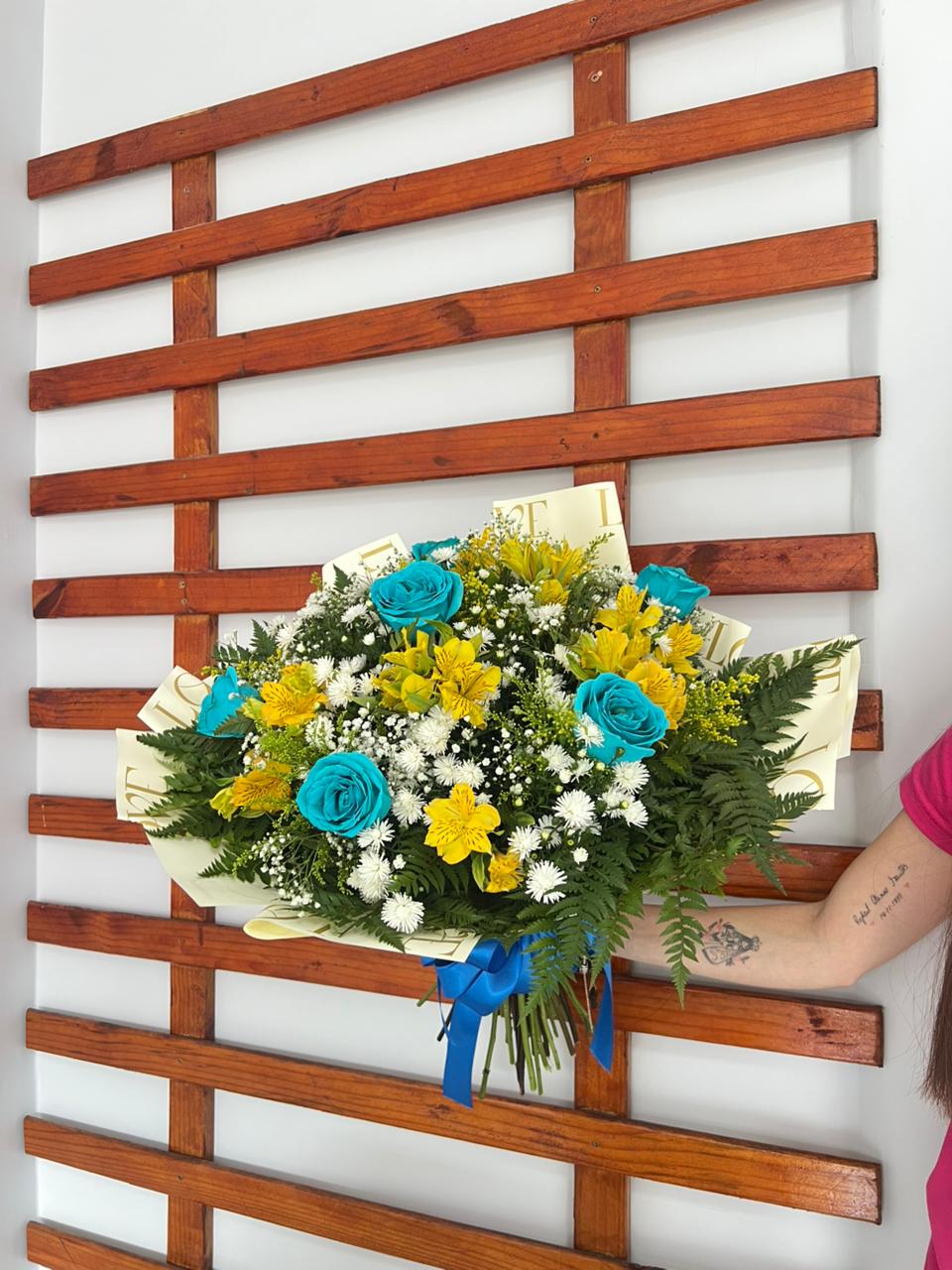 O embrulho harmoniza com os tons das flores, e o laço é escolhido para transformar esse arranjo em um presente que impressiona 🎁