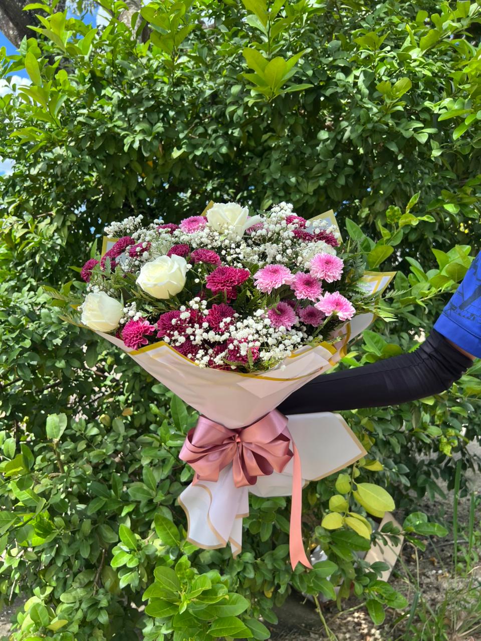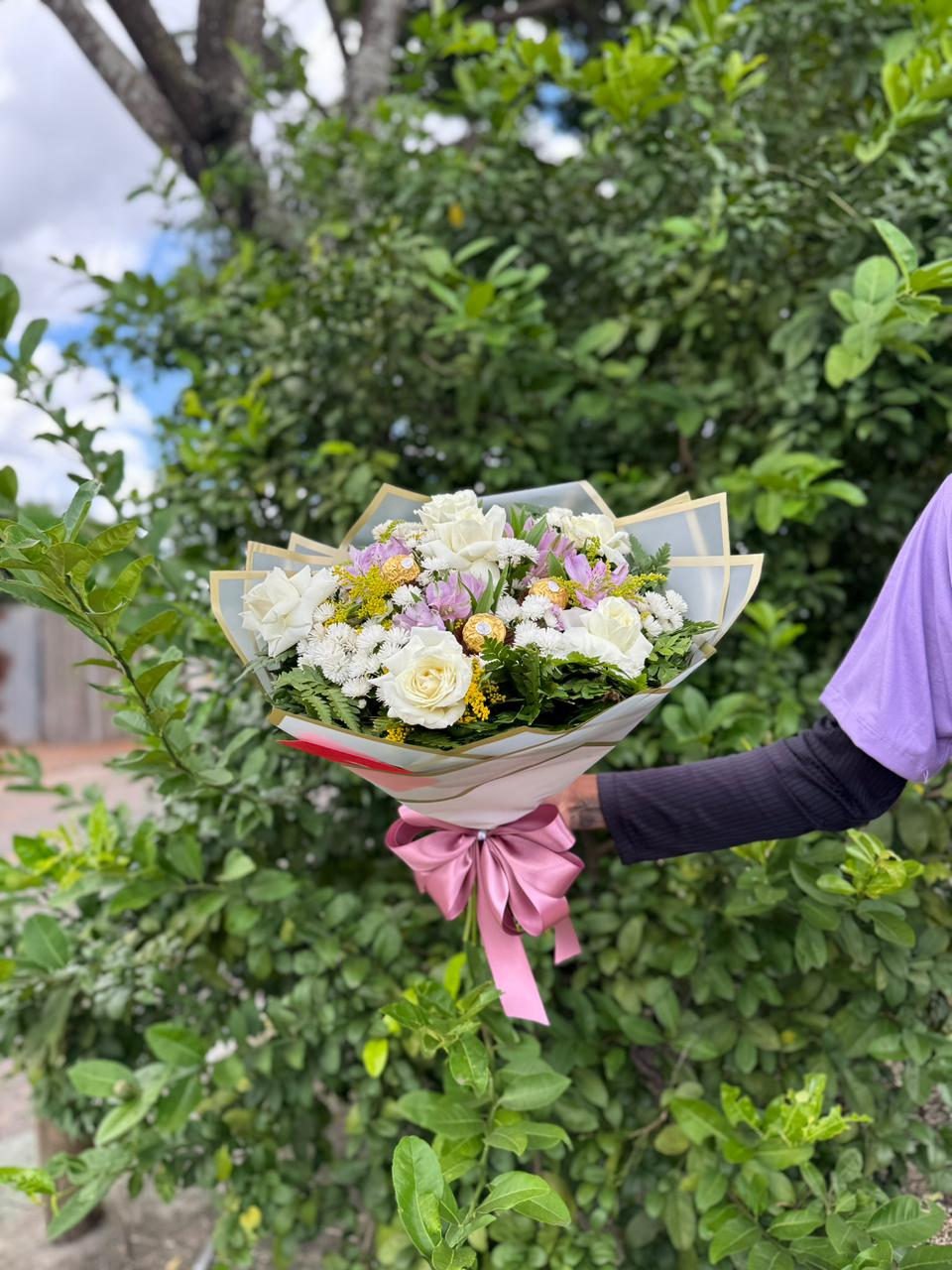 O acabamento floral respeita a suavidade das rosas, com folhagens que destacam sua beleza e um laço delicado para finalizar com muito charme 🎀