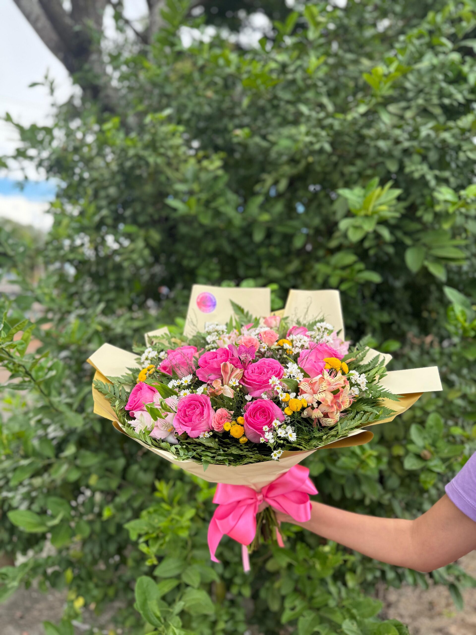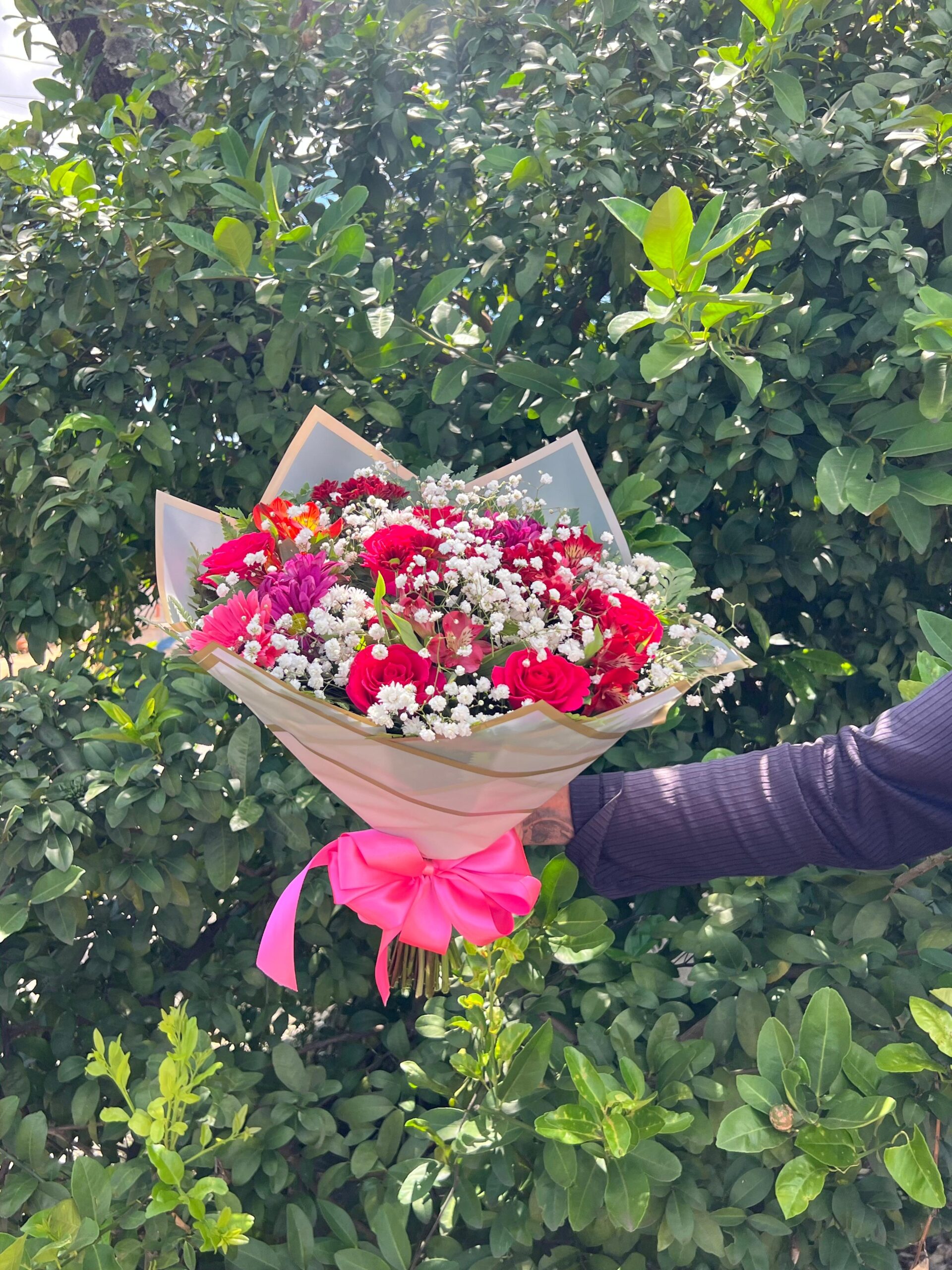 Cada detalhe foi escolhido com carinho: desde o embrulho que respeita o formato do buquê até o laço decorativo, que transforma as flores em um presente digno de suspiros 🎀✨