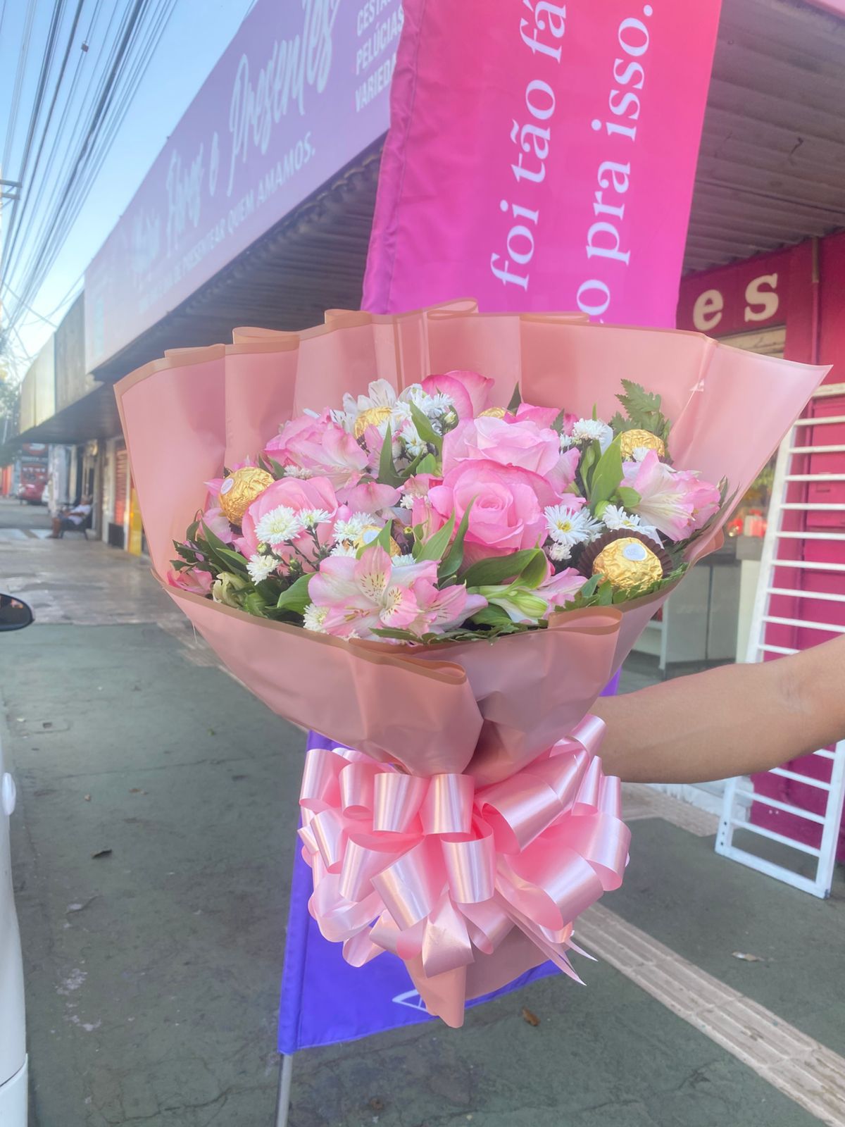 O embrulho foi pensado para realçar cada detalhe do buquê, com laço decorativo que dá aquele toque especial de presente 🎀✨