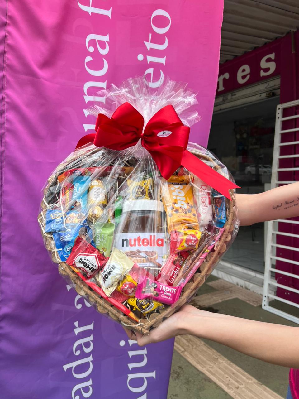 No centro, uma irresistível Nutella gigante (800g a 1kg) rouba a cena, cercada por uma seleção deliciosa de bombons, trufas e guloseimas que fazem qualquer coração derreter.
