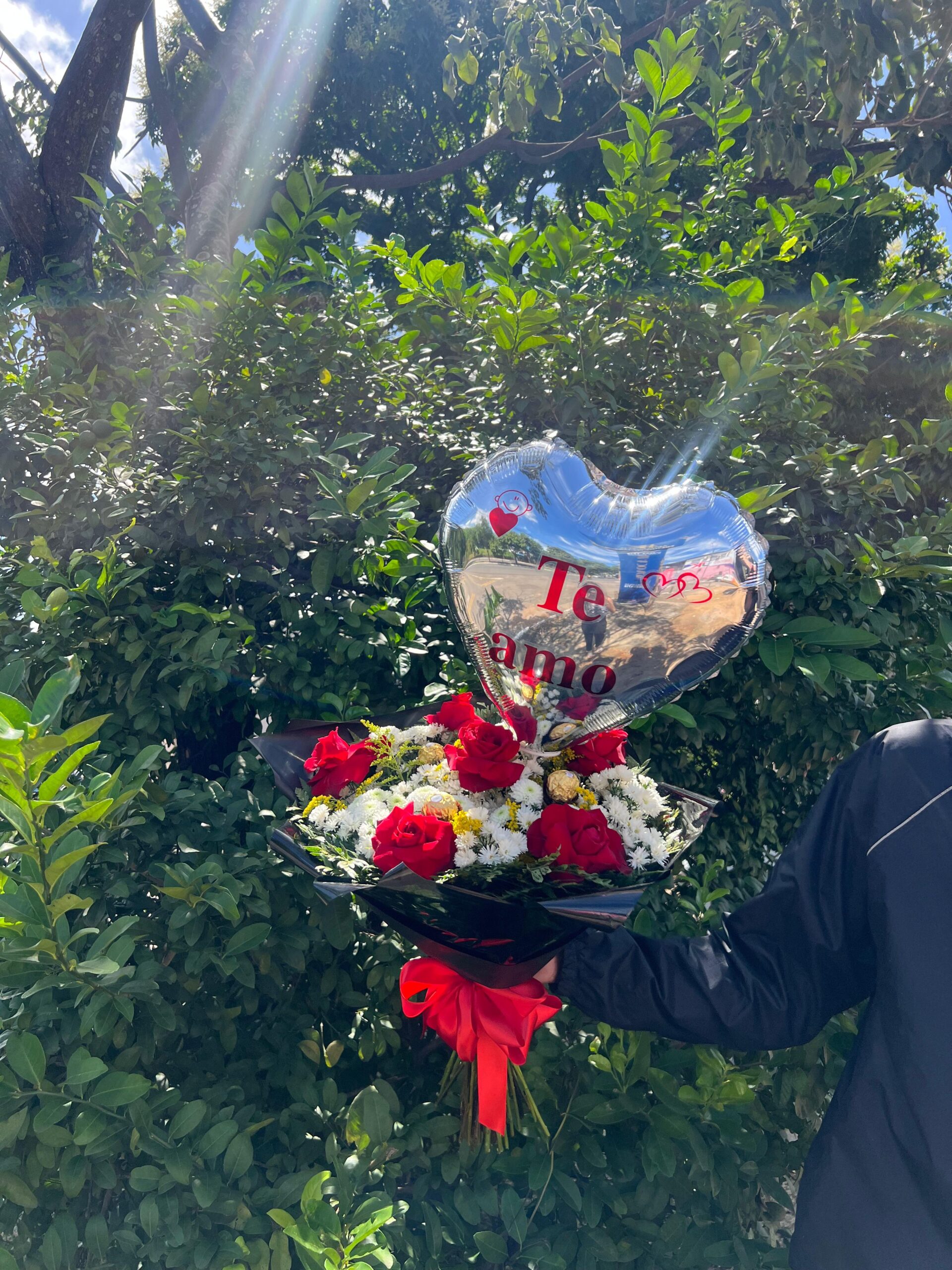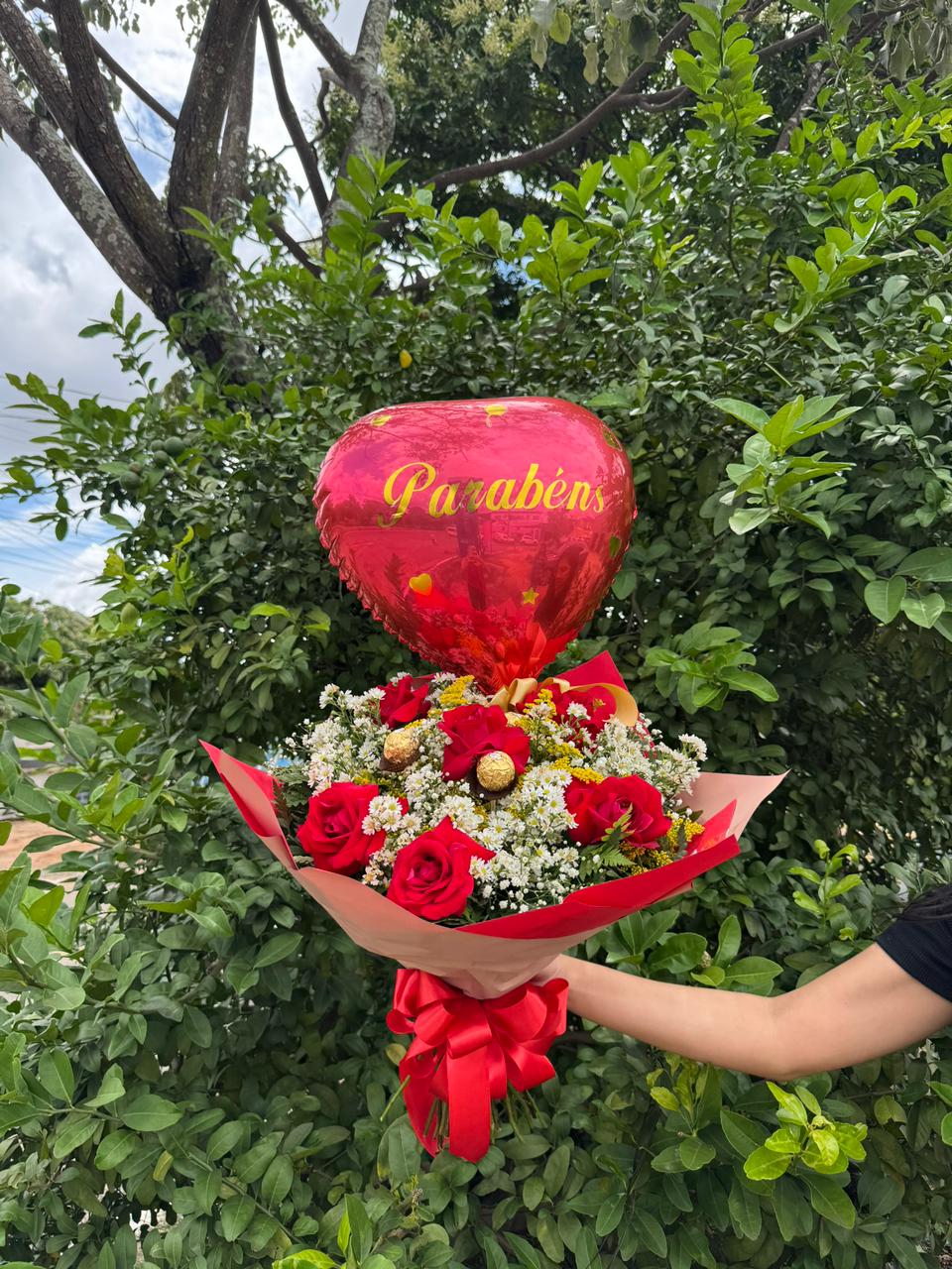 Composto por 6 rosas frescas e selecionadas — podendo ser na cor vermelha ou rosa Vânia —, acompanhadas por flores complementares e folhagens, o buquê possui um acabamento harmonioso e elegante. Acompanha 3 Ferrero Rocher, trazendo um toque de doçura, além de um balão personalizado, ideal para celebrar com ainda mais emoção.