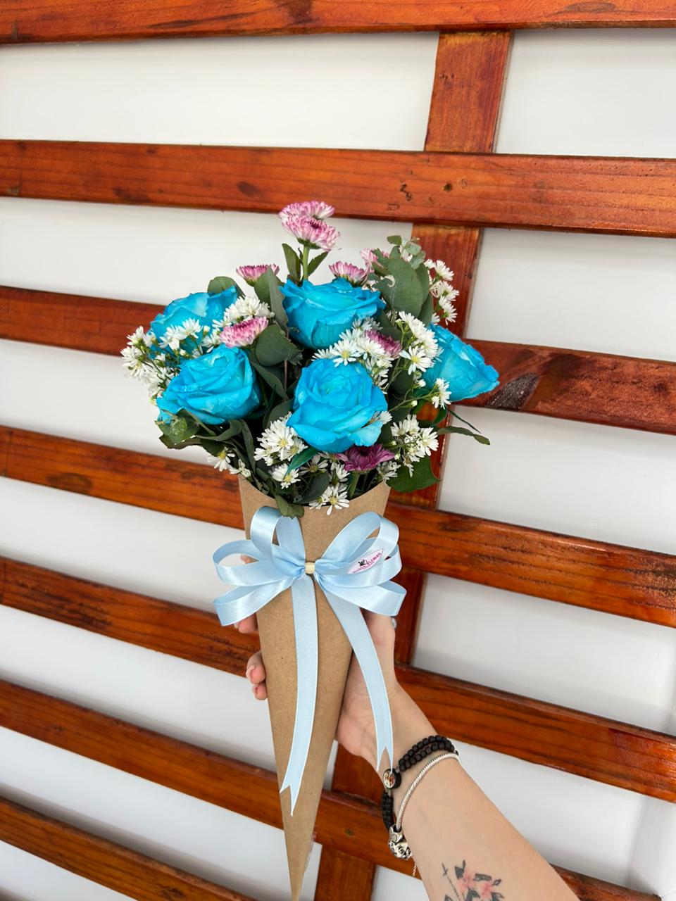 Delicado, moderno e cheio de significado — assim é o nosso Cone Floral com cinco rosas azuis, uma opção charmosa para surpreender quem você ama.