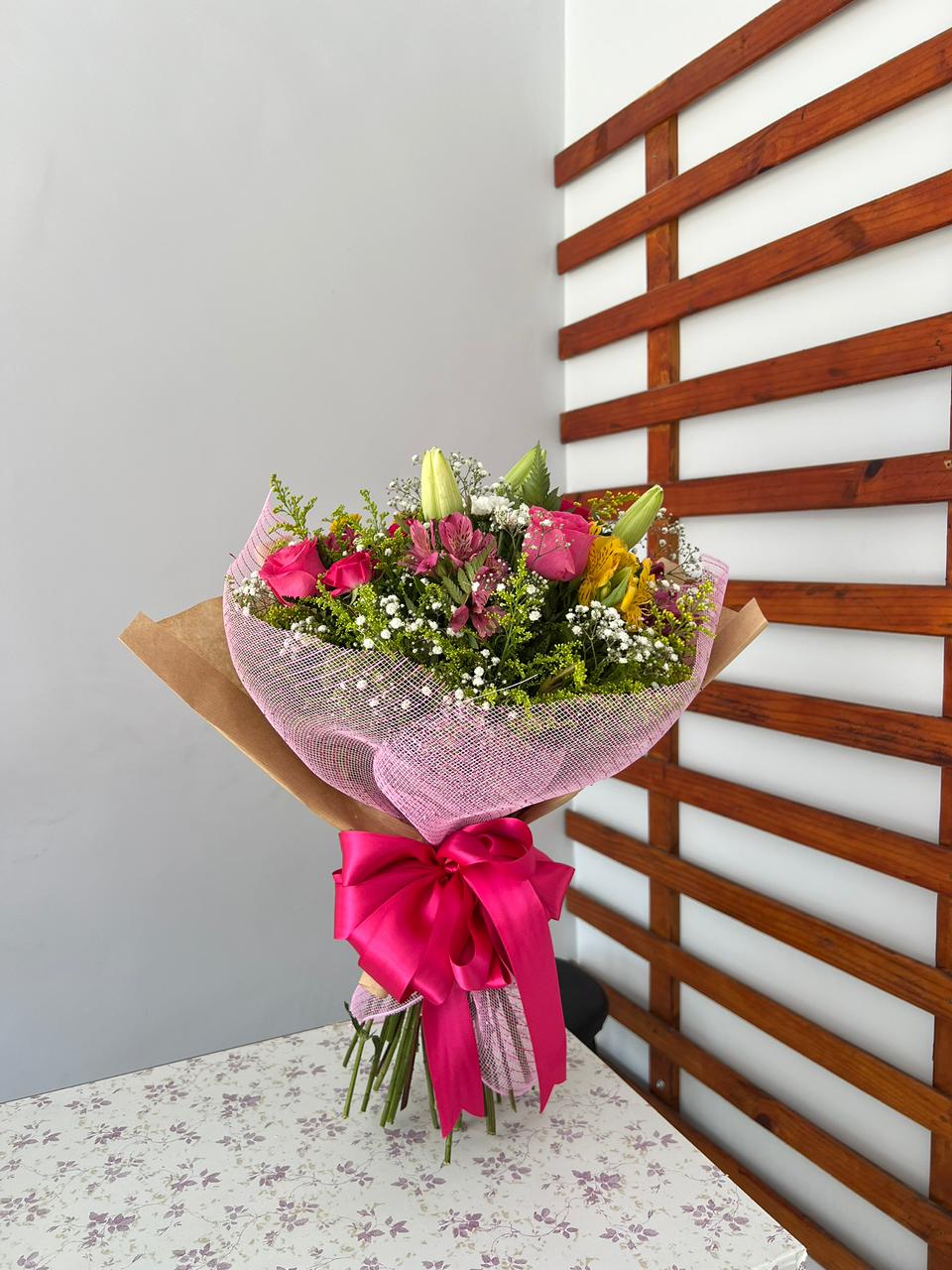 Com quatro rosas e flores nobres envoltas em acabamento rústico, esse bouquet é ideal para presentes delicados, declarações discretas e momentos marcantes.